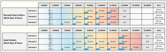 Rest schedule changes for burned and seed cane cutters: Existing (Harvest 1) and enhanced rest schedules observed (Harvest 2, Harvest 3), each providing more frequent and earlier rest periods. * Rest period at 08:00 a.m. in Harvest 2 was increased to 15 min for the last month of the harvest.