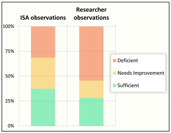 Overall, results were similar from data collected by ISA OSH and the researchers in the period prior to the COVID-19-related restrictions when both teams used the same structured intervention implementation assessment tool (Appendix A provides an example used for the burned cane cutting job) during the limited time for observations (Figure 6). Across the jobs and settings, only about one-quarter of the prevention program demonstrated “sufficient” implementation of the full program. A notable outcome of this finding was that formal assessment by the mill’s OSH personnel led to their own documentation that their goals were not being attained.