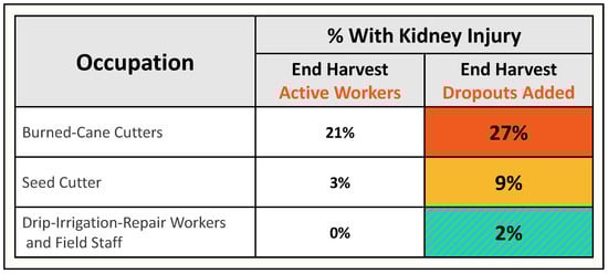 Baseline cross-harvest rates of kidney injury by job type with and without dropouts (adapted from reference []).