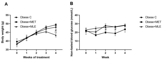 In this study, diabetic mice were grouped into obese C, obese + MET and obese + MLE groups. Mice were administered their respective treatments daily for 29 days, during which bodyweight and non-fasted blood glucose were measured weekly.