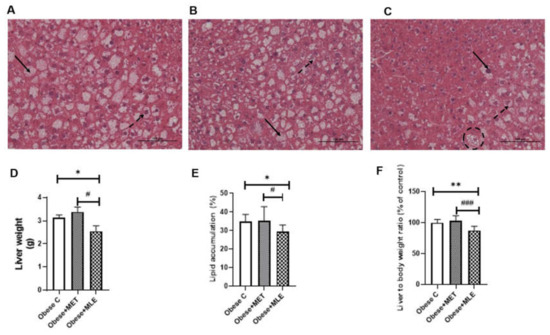 Hepatocellular steatosis, liver weight and percent lipid accumulation results. Representative photomicrographs of liver cross-sections of the obese C (A), obese + MET (B) and obese + MLE (C) mice. Histologically steatosis severity was classified by the number and distribution of hypertrophied hepatocytes (dotted circle) with either macrovesicular (bold arrows) or microvesicular (dotted arrows) steatosis. All photomicrographs were stained with H&E at 40× magnification. Liver weight (D), % lipid accumulation (E), and liver to body weight ratio (F) results are represented as means ± SEM, with a sample size of 5/group (10 images per slide were taken). GraphPad Prism 9 was used to test for statistical significance at a p-value ≤ 0.05. Note: * p ≤ 0.05 and ** p ≤ 001 vs. obese C, # p ≤ 0.05 and ### p ≤ 0.0001 vs. obese + MET.