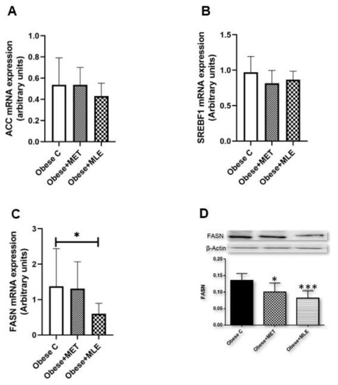 Hepatic lipid accumulation is dependent on the uptake of circulating plasma fatty acids as well as de novo lipogenesis (DNL), the latter of which is largely transcriptionally regulated. Thus, the study sought to ascertain the influence of Marula leaf extract (MLE) on the gene regulatory network associated with DNL. While MLE did not significantly affect mRNA expression of acetyl-CoA carboxylase (Acc) or sterol regulatory element binding transcription factor 1 (Srebf1) (Figure 3A,B), mice presented with a significant reduction (Figure 3C; p ≤ 0.05) in fatty acid synthase (Fasn), the rate-limiting enzyme in DNL, as compared with the obese C group. These findings were further validated by Western blot data, where FASN protein expression was significantly reduced by MLE treatment as compared with the obese C group (Figure 3D; p < 0.05). Interestingly, metformin (MET) treatment significantly reduced FASN levels as compared with the obese C group (p < 0.05).