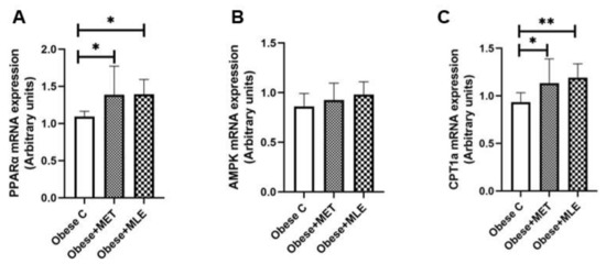 Hepatic steatosis, a hallmark of non-alcoholic fatty liver disease (NAFLD), arises when there is an imbalance between lipid acquisition (i.e., fatty acid uptake and lipogenesis) and expenditure (i.e., lipid export and β-oxidation). Thus, we assessed the role of MLE on mRNA expression of key β-oxidation genes, peroxisome-proliferator-activated receptor alpha (Pparα), AMP-activated protein kinase (Ampk) and carnitine palmitoyltransferase I (Cpt1). Here, obese + MET mice presented with significant increases in Pparα and Cpt1 (Figure 4A,C; p < 0.05), while Ampk mRNA expression (Figure 4B) was not affected as compared with the obese C group. Of particular interest, the data revealed that obese + MLE mice had significantly higher levels of Pparα (Figure 4A; p < 0.05) and Cpt1 (Figure 4C; p < 0.01), while Ampk was not affected as compared with the obese C group (Figure 4B). Of the 3 genes studied, we did not observe any differences between the obese + MLE and obese + MET mice.
