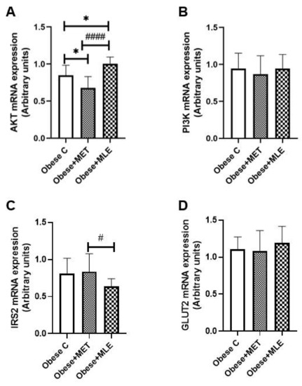 Non-alcoholic fatty liver disease commonly occurs in the background of insulin resistance, a hallmark of T2DM. As such, this study aimed to determine the effects of MLE on genes involved in insulin signaling, namely Akt, phosphatidyl-inositol-3-kinases (PI3k), Irs2 and Glut2. The results showed that obese + MET mice had significantly reduced hepatic Akt mRNA levels as compared with the obese C group (Figure 5A; p < 0.05). Further, treatment with MLE induced a significant increase in the expression of Akt mRNA when compared with both the obese + MET and obese C mice (p < 0.0001 and p < 0.05, respectively). In addition, while obese C and obese + MET groups did not differ in terms of the Irs2 mRNA expression levels, MLE-treated mice presented with a significantly lower expression level of Irs2 only when compared with obese + MET mice (Figure 5C; p < 0.05). However, neither treatment affected the mRNA expression levels of PI3k (Figure 5B) or Glut2 (Figure 5D) as compared with the obese C mice.