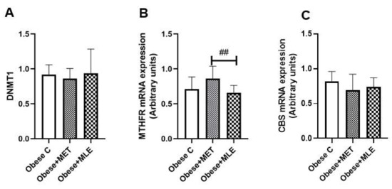 One-carbon metabolism is a series of enzymatic reactions that function to generate methyl groups that are utilized in DNA methylation reactions. It encompasses folate and methionine cycles, while it is also closely associated with pathways such as transsulfuration. Mthfr mRNA expression was significantly higher in obese + MET mice as compared with obese-MLE mice (Figure 6B; p < 0.01). Though not significant, the obese + MET group displayed increased Mthfr mRNA expression as compared to the obese C group. Obese + MLE treatment did not influence the transcription of Mthfr when compared with the obese C mice. Neither treatment affected the expression levels of DNA methyltransferase 1 (dnmt1; Figure 6A) or cystathionine-β-synthase (Cbs; Figure 6C) as compared with the obese C mice.