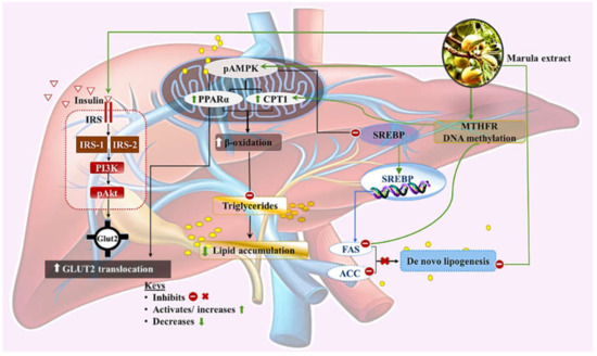 Further, the current study attempted to ascertain whether the inhibitory effect of MLE on the formation of hepatic lipid droplets could be due to the modulation of genes involved in lipid metabolism. Here, we showed that MLE treatment significantly downregulated the expression of Fasn while upregulating Pparα and Cpt1. While FASN is a terminal enzyme in de novo lipogenesis (DNL), Pparα is known to activate Cpt1, a key protein in β-oxidation. In NAFLD, DNL and fatty acid uptake exceeds the ability of the liver to prevent lipid build-up via β-oxidation and the export of very low-density lipoproteins [26]. Thus, data suggest that Marula leaf extract may suppress the accumulation of hepatic lipid droplets, in part via the activation of β-oxidation.