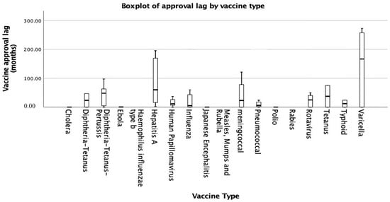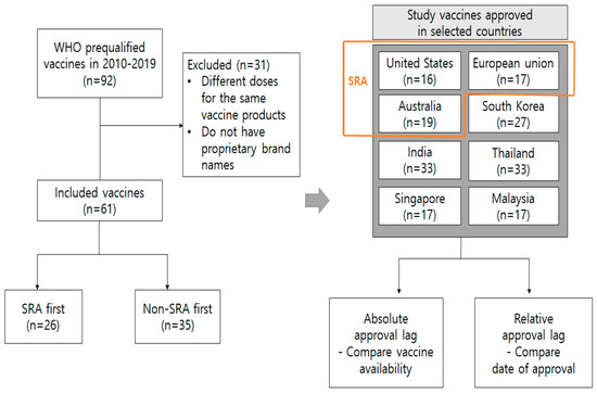 The 61 vaccines we extracted were divided into two groups based on their first approval pathway, that is, vaccines that were first approved by the stringent regulatory authority (SRA first) (the stringent regulatory authority (SRA) Australia, Austria, Belgium, Bulgaria, Canada, Cyprus, Czech Republic, Denmark, Estonia, Finland, France, Germany, Greece, Hungary, Iceland, Ireland, Italy, Japan, Latvia, Liechtenstein, Lithuania, Luxembourg, Malta, Netherlands, Norway, Poland, Portugal, Romania, Slovakia, Slovenia, Spain, Sweden, Switzerland, United Kingdom, and United States of America [27]. Organization, W. H. List of Stringent Regulatory Authorities (SRAs). http://www.who.int/medicines/regulation/sras/en/ (accessed on 22 January 2021)) and those that were first approved by non-SRA (non-SRA first). The stringent regulatory authorities (SRA) are the national regulatory agencies, which are the members or observers, or associates of the International Council for Harmonisation of Technical Requirements for Pharmaceuticals for Human Use (ICH) [27].