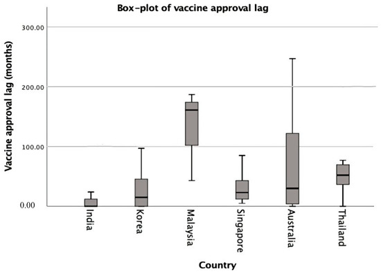 Due to the difficulty of collecting vaccine approval data and approval dates, some data may be missing, especially for Malaysia and India. These countries have no online searchable databases for vaccines; the approval data from India was obtained from a summary of product characteristics, and the approval data from Malaysia was obtained from a Registered Product List. The challenge in data collection resulted in the small sample size in the analysis. Therefore, the relative drug lag in some countries might not represent the actual relative drug lag in those countries. The analysis of possible reasons behind the delays in approval of vaccines in the Asia-Pacific region is not conducted in this study, due to the limitation of data available. The same question needs to be addressed for vaccine approval for coronavirus disease (COVID-19) in future studies.