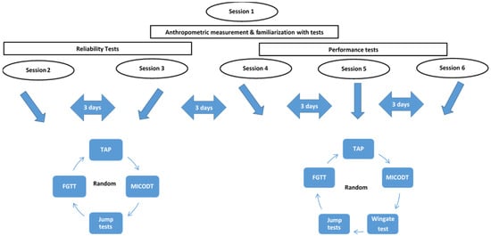 Each participant was asked to be present on six sessions. The first session was reserved for anthropometric measurements and familiarization with all tests including the TAP and FGTT tests. The height (m) of each player was measured to the nearest 0.1 cm using a stadiometer (Holtain Ltd., Crymych, UK). Weight (kg) and body fat were determined using the Tanita MC-780 body composition analyzer (Tanita Corp., Tokyo, Japan) following the manufacturer’s instructions []. All anthropometric measurements were measured twice by two examiners. The second and third sessions were devoted to studying the reliability of tests. During the fourth, fifth and sixth sessions, all subjects performed the TAP, FGTT, sprint, agility, jumping tests and the Wingate test. Sessions were separated by three-day intervals and all tests were conducted randomly in the same regular indoor court. All subjects performed each test with at least 3 min of rest between all trials and 5 min between tests to ensure adequate recovery. The recovery time between the Wingate test and other tests was three days (Figure 1).