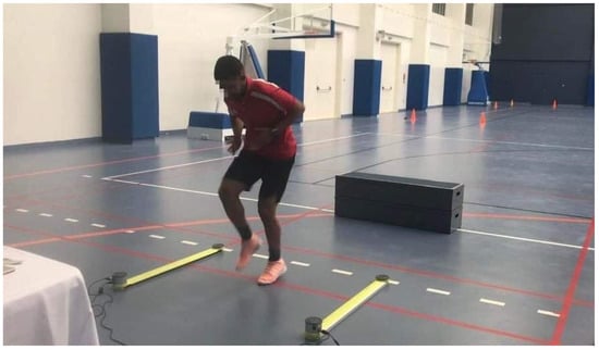 Figure 2. TAP test. In standing up position, the players are asked to tape the feet as quickly as possible on the ground with two alternating limbs for 4 s using Optojump Next (Microgate Next, Bolzano, Italy). - The finger tapping test: The FGTT procedure used in this study was the one described in the study of Austin et al. []. Three trials have been performed each for both the dominant and non-dominant hands and scores were measured with a smartphone application (HLTapper V.1.0), validated by Lee et al. []. This application is composed of two rectangles of 30 by 45 mm, separated by 15 mm. Smartphone timed tapping test subjects were asked to alternately tap each side of the rectangles using an index finger at their fastest speed for ten seconds without moving the rest of their hand or arm. The FGTT score is reported as the best number of taps recorded during the 6 trials (both dominant and non-dominant hand) then the tapping score was calculated as FGTT = Score/10 s.