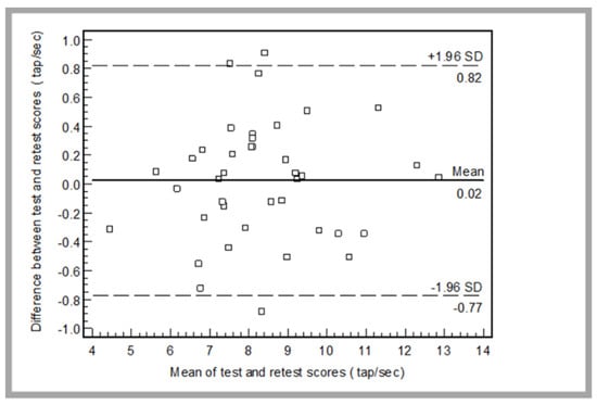 Statistical analysis showed that all data are normally distributed (p > 0.05). There was no significant difference between the TAP test and retest scores measured (8.35 ± 1.74 tap·s−1 vs. 8.33 ± 1.71 tap·s−1; p = 0.71).