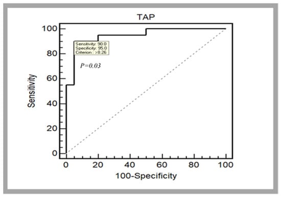 Regarding the difference between the two soccer player groups’ level, the results showed that NL players presented a higher TAP score (p < 0.001; dz = 1.96, large) in comparison with RL players (9.68 ± 1.41 tap·s−1 vs. 7.28 ± 1.01 tap·s−1, respectively). The average difference in the blood lactate level (Δ[Lac]) and heart rate (ΔHR) measured before and after performing the TAP test was low for both groups (2.1 ± 1.8 mmol·L−1; 36.2 ± 13.3 bpm and 2.5 ± 1.4 mmol·L−1; 32.8 ± 11.3 bpm, respectively, for NL and RL groups). The value of area under the curve (AUC) measured was 0.95 (95% CI: 0.827–0.99, p = 0.03). The resulting cut-off for the TAP score was <8.26 tap·s−1 (Figure 4).