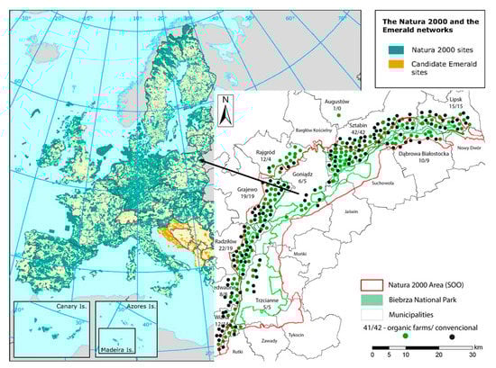 N2K is one of the world’s largest conservation networks, which currently covers over 18% of the land territory and over 8% of the maritime territory of the EU [,]. On the other hand, rural regions account for 88.2% of the EU territory (these are mostly rural or intermediate areas) while containing the vast majority of its natural resources []. Agricultural land accounts for approximately 40% of the total N2K network area. Therefore, many habitats and species protected under the Habitats [] and Birds [] Directives are dependent on or linked to agricultural practices. The survival of many habitats and species is dependent on extensive local farming. As a high biodiversity level usually coincides with low agricultural productivity, most of the agricultural land in the N2K network is located in agricultural areas that are less significant in economic terms []. It is worth stressing that traditional agricultural landscapes provide, in a natural manner, a number of ecosystem services, e.g., soil fertility, water and climate regulation, and aesthetic and cultural benefits [,,,,]. This implies that sustainable agriculture of a high natural value (HNV) is a priority in achieving the aim of halting the loss of biodiversity in the EU. However, extensive agriculture is unprofitable in many regions of the EU, which results in it being either abandoned or intensified in the absence of financial support [,,]. New solutions are needed to make this production system more profitable while sustainably increasing food production and the conservation of resources on which the development of agriculture and the prosperity of local communities depend [,]. Hence, organic farming (OF), which is most often supported with public funds, can be an alternative to conventional agriculture in N2K areas. OF is an on-farm production management system that is closely linked to the quality of the natural environment, as in addition to food production, it is a protective factor for all components of this environment [].