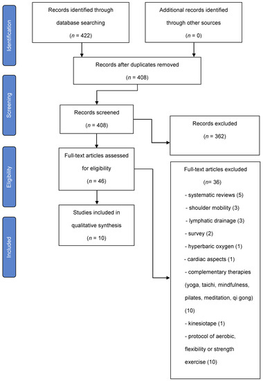 Studies where the intervention was aerobic or resistance exercise programs, breathing exercises in yoga, qigong, tai chi, and pilates, and those where the patient was receiving palliative treatment, were excluded.