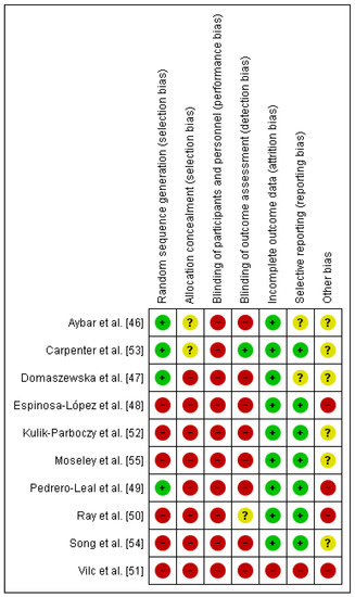 Risk of bias summary [46,47,48,49,50,51,52,53,54,55].
