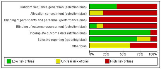The Cochrane Risk of Bias Assessment Tool was used to assess the risk of bias of the articles included in this review. The results of the risk of bias can be observed in Figure 2. It should be noted that the risk of bias is high in relation to performance bias and detection bias because patients and therapists were not blinded, and in only one article were the evaluators blinded [53]. The risk of bias is also high in relation to selection bias because there was random sequence generation in only four of the trials [46,47,49,53]. With respect to attrition bias, all of the them were low-risk, except one [51] (Figure 3).