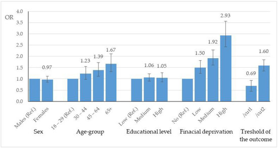 The results of the OLR analysis are shown in Figure 1. Odds ratios (ORs) and 95% confidence intervals of the sociodemographic factors were reported in relation to the HL-COVID levels. Considering the sociodemographic factors simultaneously in the regression model, only the age classes older than 45 years and the financial deprivation classes were significantly associated with HL-COVID levels. In particular, the odds of sufficient/limited HL-COVID levels increased by 39% in persons aged from 45 to 64 years and by 67% in persons aged 65 years and older compared with persons aged 18–29 years (reference category for age). Similarly, the odds of a low HL-COVID level (sufficient/limited) increased by 50%, 92%, and almost triple in persons with a low, considerable, and severe financial deprivation level, respectively.