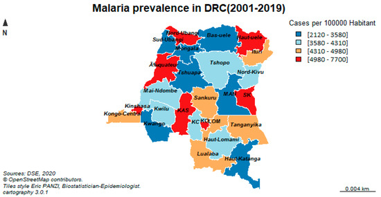 Figure 1. Geographic distribution of malaria prevalence in the DRC from 2001 to 2019.