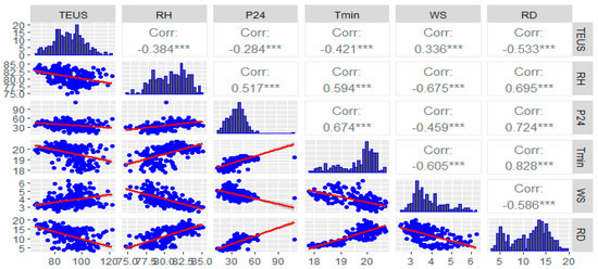 Figure 2. Scatterplot matrix showing the correlation study variables. The values of each variable were normalized by the transformation to its empirical percentile. See the legend of the study variables in the Appendix A. *** Statistically significant p-value of <0.0001.