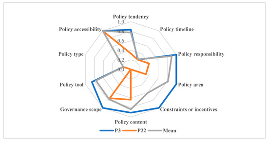 In order to perform a clear comparison, the policies with the highest and lowest PMC indexes were further analyzed by backtracking the scores of first-level indexes and second-level indexes. For example, the score differences between P3 and P22 in first-level indexes can be found in Table 6, and are visually shown in Figure 4. On the whole, the PMC indexes of policy responsibility (X3), policy area (X4), constraints or incentives (X5), governance scope (X7), and policy accessibility (X10) in policy P3 were all equal to 1. Moreover, the scores of the constraints or incentives (X5), governance scope (X7), and policy area (X4) indexes were much higher than average. By contrast, in the case of P22, the scores of most of its second-level indexes, except for policy type (X9) and policy accessibility (X10), were lower than the mean. Great differences existed between P3 and P22 in aspects of the policy responsibility (X3), policy area (X4), and policy tool (X8) indexes. Based on this comparison, we further explored the reasons for differences. In P3, all types of responsible subjects, from government to residents, are included, since this policy is a national guideline for promoting waste sorting management and improving urban service. At the same time, its content reflects a combination of environmental and socioeconomic management. By comparison, P22 is a special notice from a municipal governmental department, which emphasizes that the governmental department must play a leading role in waste management. P3 calls for the use of multiple policy tools including regulation, education, and mechanisms; for example, it proposed to innovate the current working system by introducing professional service companies or adopting types of franchising and leasing. It also emphasized the development of training, professional knowledge, and skills for garbage classification and collection. By comparison, hardly any policy tool is called for in P22.