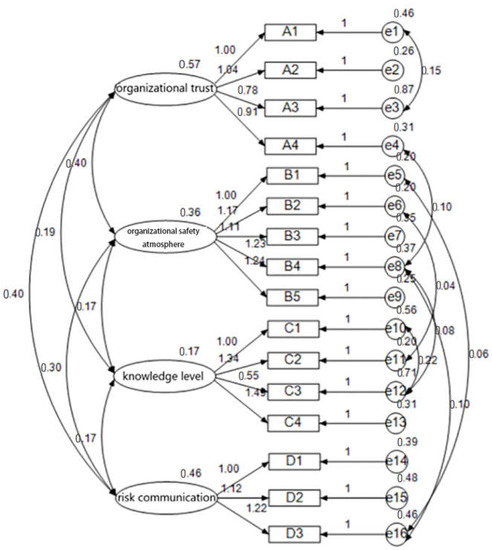 Factor 1 had 4 items, which had relatively higher factor loading (0.664–0.815), indicating that 4 items belonged to a unified project. These items had a closed relationship with interpersonal trust. So, factor 1 was named organizational trust. As mentioned above, Factor 2, named organizational safety atmosphere, contained 5 items (factor loading: 0.557–0.784). Factor 3, named knowledge level, included 4 items (factor loading: 0.604–0.806). Factor 4, named risk communication, covered 3 items (factor loading: 0.612–0.782).