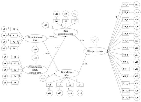 In order to test reliability and validity, a four-factor model was established with organizational trust, organizational safety atmosphere, knowledge level, and risk communication as potential variables (see Figure 1). After modifying the model, the chi-square value (CMIN) = 102.344 and the significant value of p = 0.216 (>0.05), which showed that the model had acceptable fitness (see Table 2). As for CMIN/DF = 1.112, GFI = 0.932, AGFI = 0.901 > 0.9, RMR = 0.035 (close to 0), RMSEA = 0.026 (<0.05), and CFI = 0.992 (close to 1), the data met the basic requirements and the SEM model was improved.
