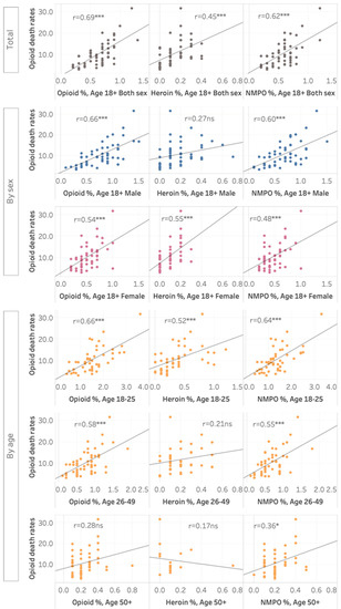 The finding that the prevalence of opioid dependence was significantly correlated with opioid-related mortality, corroborated with the literature that determined that individuals with long-term opioid dependence are at a higher risk of overdose [3,14]. Our finding that heroin dependence was significantly associated with opioid-related deaths in the young-to-middle-aged groups imply that younger adults comprise the primary demographic for heroin use, so they may constitute a candidate for targeted awareness and intervention initiatives [27]. While heroin use had traditionally been a predominately male problem, we found that the prevalence of heroin and NMPO dependence were associated with opioid-related deaths in females. The needs of people who use drugs are likely to differ by sex. For example, females who use NMPOs are more likely to have comorbid depression [28]. Our findings provide further support for gender-appropriate strategies to reduce opioid-related harms.