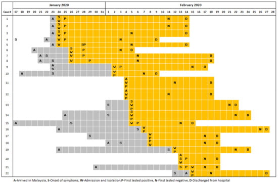 Timelines of the 22 cases in the first wave of COVID-19 infections in Malaysia.