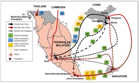Spatial spread of COVID-19 into Malaysia during the first wave. (Numbers in boxes represent the case number).
