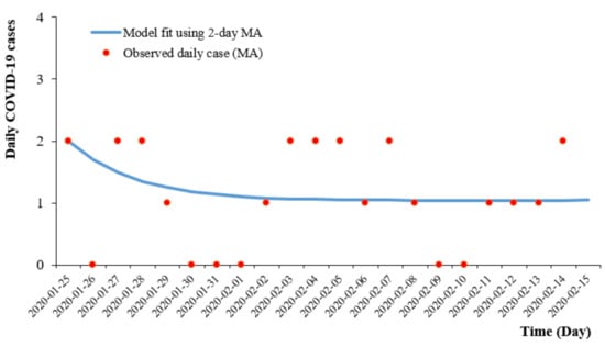 Malaysia is a country in South East Asia with a population of over 32 million in 2020. The first COVID-19 case in Malaysia was detected on 25 January 2020, and 21 more were reported in the following days. After 15 February 2020, no new cases were reported during the subsequent 11 consecutive days, and cases during the second wave, which started on 27 February 2020 were unrelated and had no epidemiological link to any of the first 22 cases. Thus, these 22 cases were regarded as the first wave, and later cases were categorized as the second COVID-19 wave of infections. Therefore, the first wave was an isolated event because there was no epidemiological link between the first wave and second wave, as evidenced by the 11 days’ gap of no cases between the two waves and the variations in the factors that resulted in these waves, wherein the first wave was due to importation of the virus into Malaysia by travellers from other countries (i.e., China, Singapore) whereas the second wave was due to mass gathering events [,]. With Malaysia experiencing several waves of COVID-19 [], there is a need to analyse the data in the first wave to better understand its dynamics, which subsequently resulted in the ending of that cluster of cases.