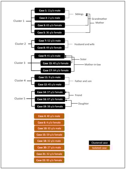 Epidemiological links were found for 63.6% (n = 14) of the cases and five clusters were identified as follows: