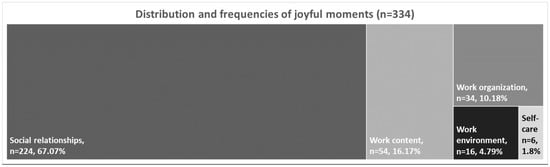 Within 33 out of 237 diary entries, participants reported the absence of joyful moments. Therefore, the results are based on 204 diary entries. Home health care workers identified 60 different types of joyful moments. In sum, these joyful moments were mentioned 334 times. Figure 1 presents the distribution and frequencies of joyful moments in the applied deductive categories (1) social relationships, (2) work content, (3) work organization and (4) work environment. No mention was found within the deductively applied category new forms of work; the category self-care was developed inductively based on the material.