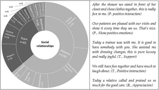 Unfortunately, Wilkes et al. [] do not present a differentiated analysis of their results or a detailed explanation of identified topics beyond using quotes. However, the topics “to do and share with others”, “connect with others” and “supporting others” identified by Wilkes et al. [] may be comparable to the category of social relationships with patients in this study. Within this category, positive interaction with patients was the sub-category mentioned most often within the audio diaries. Having fun together was the most prominent topic related to positive interactions with patients, but it was also mentioned frequently with regard to the home health care team and relatives (see also Appendix B). Humor as an expression of positive emotions between patients and home health care workers was accordingly observed by Heyn et al. []. Moreover, humor was found to be a useful strategy for improving social relations or dealing with stressful situations in nursing, as Navarro-Carillo et al. [] explored: positive humor styles showed positive associations with happiness, sociability, hope and life satisfaction in nurses.