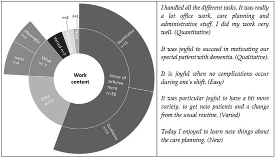 Within the deductive category work content, nine sub-categories were inductively developed. Joyful moments related to a sense of achievement were mentioned most often. These joyful moments referred to the successful mastery of challenging situations, classified within quantitative challenges and qualitative challenges. Having an easy working day without any complications and valuing one’s own work were mentioned second and third most frequently, respectively. Furthermore, subjects reported experiencing varied, interesting and new work contents as joyful. All categories up to level three (level four is presented in Appendix B), frequencies of mentions and related quotes are presented in Figure 3.
