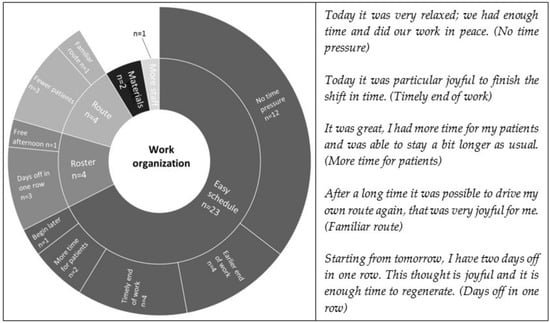 The category work organization comprises 11 sub-categories. Aspects related to an easy schedule, such as no time pressure, earlier or timely end of work or later beginning of the working day, were reported most often. These aspects were followed by joyful moments referring to the feeling of being pleased with the planning of the roster and the route, having appropriate working materials and there being more staff on duty than usual. Figure 4 illustrates the categories’ structure, the number of mentions for each category, and related statements.