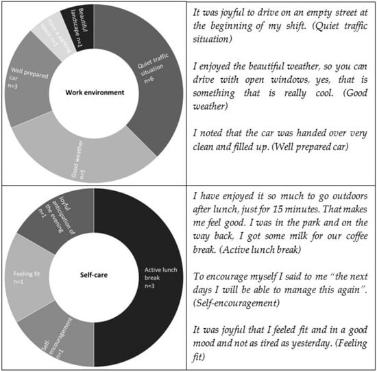 The category work environment includes five inductively developed sub-categories, all related to being on the road. Within these categories, joyful moments related to a quiet traffic situation were mentioned most often, followed by good weather and a well-prepared car. The inductive category self-care includes joyful moments related to an active lunch break, self-encouragement, feeling fit and having a joyful anticipation of one’s evening.