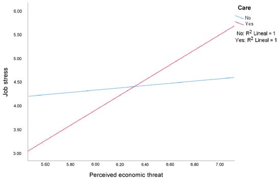 The caregiving variable modulated the relationship between perceived economic threat and job stress in the face-to-face work modality (β = 1.39, SE = 0.439, t = 3.171, p = 0.02). In particular, the positive relationship between perceived economic threat and job stress was more pronounced in those who have dependents under their care (Figure 1).