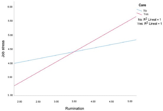 The caregiving variable also modulated the relationship between rumination and job stress in the face-to-face work modality (β = 0.53, SE = 0.23, t = 2.291, p = 0.02). The positive relationship between rumination and work stress was also more pronounced in those who have dependents under their care (Figure 2).