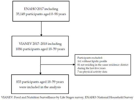The 2017–2018 VIANEV collects data from three domains: Metropolitan Lima (capital of Peru) and the remaining urban and rural areas through a stratified, multistage, probabilistic, and independent sampling process [21]. The sample selection was conducted in two stages, with the primary sampling unit being a sample of randomly selected clusters and the secondary sampling unit being a sample of randomly selected households with adults aged 18–59 years, with a fasting period of at least 9 to 12 h. The sampling frame of the VIANEV survey consisted of the households that make up the National Household Survey (ENAHO in Spanish) sample, which included 1296 clusters (176 in Metropolitan Lima and Callao, 696 in the remaining urban areas, and 424 in rural areas). The level of inference is at the national, urban, rural, and Metropolitan Lima (capital of Peru) level. Further details of the methodology can be found in the Technical Report of the 2017–2018 VIANEV survey and previous studies [21,22,23].