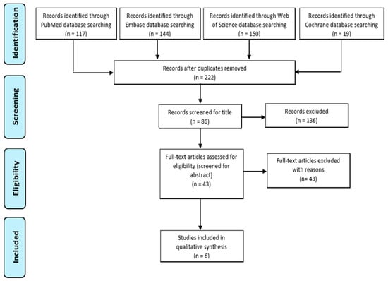 After removing duplicates, the remaining number of records was N = 212. We reviewed the title and abstract of all these records, and excluded N = 179 papers because they were not related to the topic of the research; then, we focused on N = 43 items that were reviewed as full text. We excluded N = 32 papers because they did not explain or discuss the impact of the NL interventions on FNS and food habits; finally, we excluded N = 5 articles because they involved adults. The final number of included papers was six, which specifically examined the relationship between the two concepts in children or adolescents.