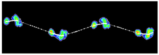 The measurement of the spatiotemporal parameters of the gait was performed using the Footscan® platform system (RSscan International, 2 m × 0.4 m × 0.02 m, with 16,384 sensors). The same measurement track was used in other studies [43,44]. Footscan 7 gait second-generation software was applied in the measurement procedure (Figure 1). The photocell Sectro timing system was used to measure the average walking speed. The measurement technique consists of determining the time between switching on the photocell at the beginning of the measuring path and switching off the next one at its end. The distance between the photocells is fixed. The signal that turns the system on and off is induced by a change in the continuity of the infrared light beam between the transmitter and receiver.