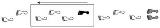 The statistical analysis of the test results included arithmetic mean values obtained from five correctly performed measurements. The study used the mid-gait protocol (Figure 3), in which it is recommended that the foot contact with the platform should take place at least on the fourth step [45,46].