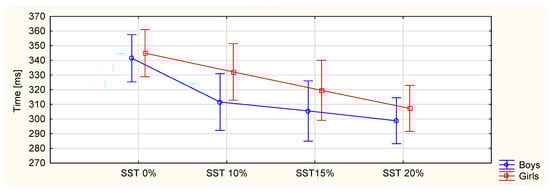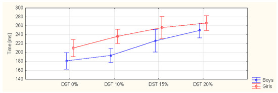 The double support time parameter increased with the external load applied. There were gender differences for the measurements with no load and 10% BW. A statistical effect was observed for girls with 10%, 15% and 20% BW and for boys with 15% and 20% BW. Other authors obtained similar results [49,53,55,57,58].