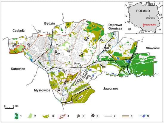 Forested areas in city of Sosnowiec, 2021. Explanations: 1—forests, 2—parks, 3—forests on the brownfield sites, 4—forest described in the article, 5—built-up areas, 6—closed coal mines, 7—main railways, 8—expressways, 9—rivers, and reservoirs. Names of highlighted postmining forests: 1—Bergi; 2—Bory; 3—Dorota; 4—Hałda Feliks/Zawodzie; 5—Jęzor Południe; 6—Józefów; 7—Kamionka—Dańdówka; 8 Kamionka—Mec; 9—Klimontów (Kopalnia); 10—Las Zagórski; 11—Lasek; 12—Milowice; 13—Rybaczówka. Names and localisation of closed coal-mines: I—Niwka-Modrzejów (Modrzejów), II—Niwka-Modrzejów (Niwka), III—Saturn (Milowice), IV—Sosnowiec (Sielec), V—Porąbka-Klimontów (Klimontów), VI—Porąbka—Klimontów (Zagórze), VII—Kazimierz-Juliusz (Kazimierz), VIII—Kazimierz—Juliusz (Juliusz). Source: by authors.