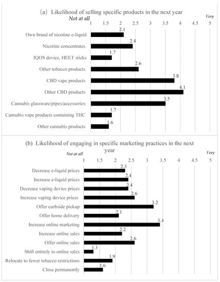 Qualitative responses (Table S1) indicated that stores planned to sell disposable e-cigarettes, and a few also mentioned nicotine-free devices and tobacco-free nicotine, depending on the FDA’s future regulations on nicotine levels and customers’ needs. In addition, the majority indicated plans to offer CBD products and accessories, with some also talking about the prospects of increasing their offerings of kratom (i.e., tropical tree leaves that contain compounds with psychotropic effects) and delta-8-THC (i.e., which produces euphoric effects similar to but milder than those of delta-9-THC, the well-known psychoactive compound in cannabis).