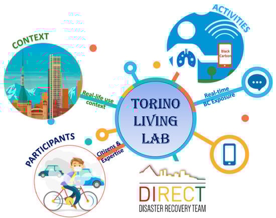This approach is particularly necessary in local situations wherein the problem of air pollutants is difficult to manage. Therefore, it is restrictive to use the data collected by national monitoring stations to study personal exposure to the main pollutants and design regulatory plans for the traffic. The Living Labs are configured as a new methodological approach that adds distinctive traits to the tradition of action research. The Living Lab Research Approach (LLRA) takes an evolutionary view of innovation and studies new technologies in complex real-world contexts []. The following article provides a summary of the LLAs used in the project “Combination of traditional air quality indicators with an additional traffic proxy indicator: Black Carbon” set in the metropolitan area of Turin in Northern Italy. Based on this topic, the project formulates three main research questions (Q):