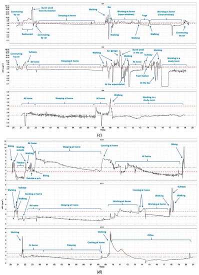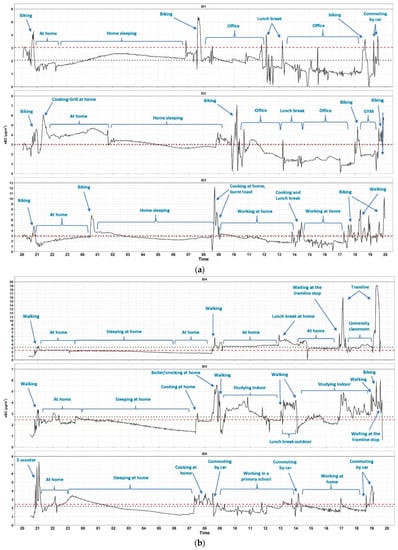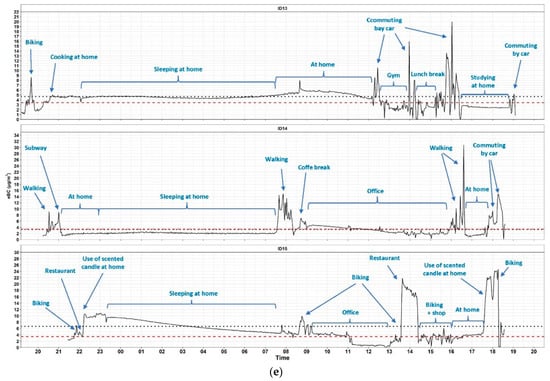 Of the 24-h measurements triggered by users, 99% of the data was captured successfully. Users showed interest in monitoring activities and great participation. The measurements were made in 12 residential houses inhabited by non-smokers and in 3 houses with smokers (no house with a closed wood stove or fireplace, 8 houses with an internal boiler located in the kitchen or bathroom; the remaining houses were equipped with an external boiler). In one house (ID15, Figure 4e), householders used scented candles. Measurements were also carried out during transportation periods, inside cars (used by six users) mostly with fully closed windows and recirculation, as well as during walking, cycling, on the subway, on electric scooters, and on the tram.