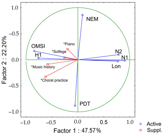 Academic performance variables were included as supplementary variables because of their weak representation in the factorial plane. The PCA shows that the academic performance variables are more closely related with the axis of musical sophistication, and in particular with positive self-perception of physical health.
