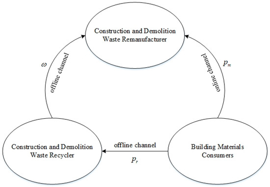 In recent years, various issues that are related to CDW management have attracted extensive academic attention. Many scholars have studied the properties of CDW itself and those of the remanufactured products that are produced from construction and demolition waste [8,9,10,11,12]. Some scholars have also studied the application of green development concepts such as circular economy theory, 3R principles and whole life cycle strategies in CDW management [2,13,14]. While these academics have made significant contributions to the development of CDW management, there are still some problems that are yet to be resolved. In the construction field, remanufacturers recycle CDW both directly from building material consumers and indirectly from CDW recyclers. As a result, there is both a cooperative relationship and a conflicting relationship between the remanufacturer and the CDW recycler, between channels.