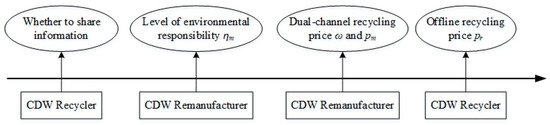 In CDW resource utilization supply chains, the remanufacturer is the leader of the Stackelberg game and the recycler is the follower. The game order (as shown in Figure 2) is: first, the recycler decides whether to share their demand forecast information with the remanufacturer; secondly, the remanufacturer decides their own environmental responsibility level according to whether the recycler shares their demand forecast information and the degree of the optimism or pessimism of that demand forecast information; thirdly, the remanufacturer predicts the recycler’s pricing situation and then determines the online and offline recycling prices for recycling CDW and, finally, the recycler decides the recycling price for their own recycling of CDW, based on the remanufacturer’s pricing.